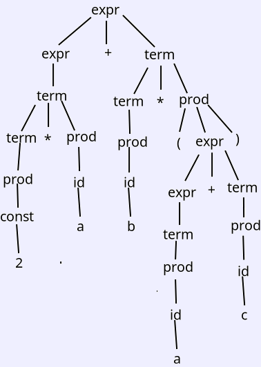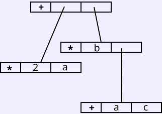 For the expression 2 * a + b * (a + b), here is the parse tree using the small expression grammar, and the corresponding abstract syntax tree.